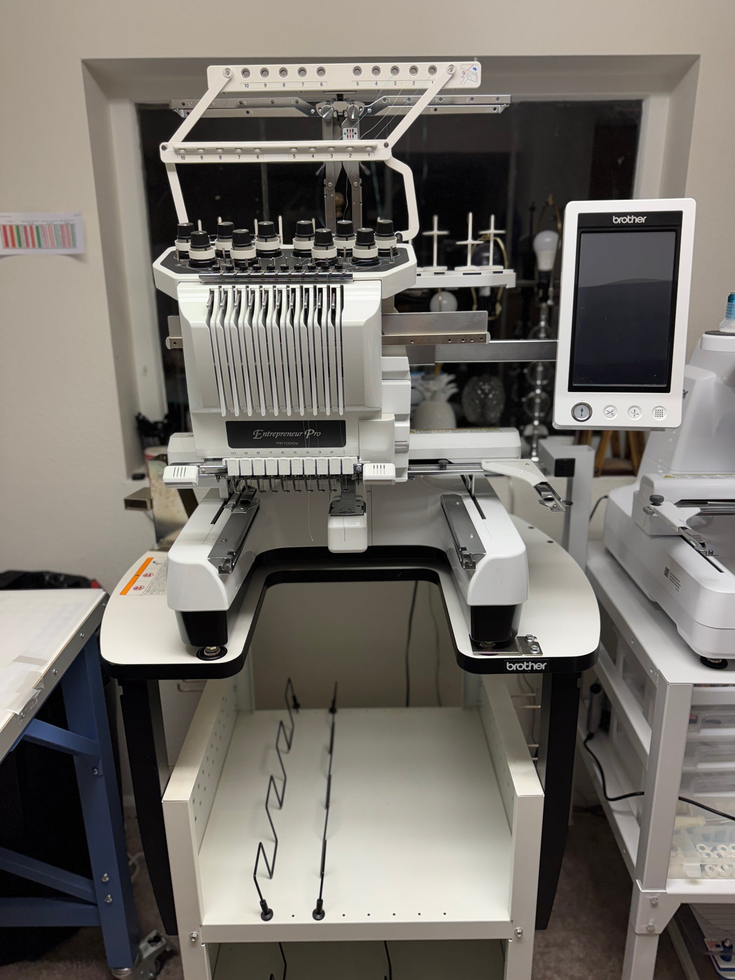 This machine has multiplied the productivity in the shop and stitches beautifully! She is probably responsible for all the large text crewnecks and t-shirts.