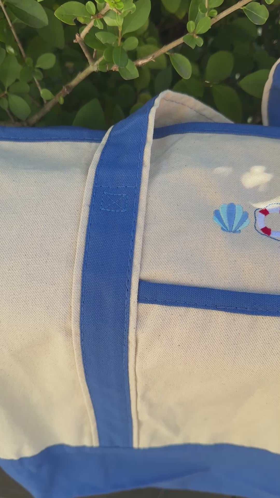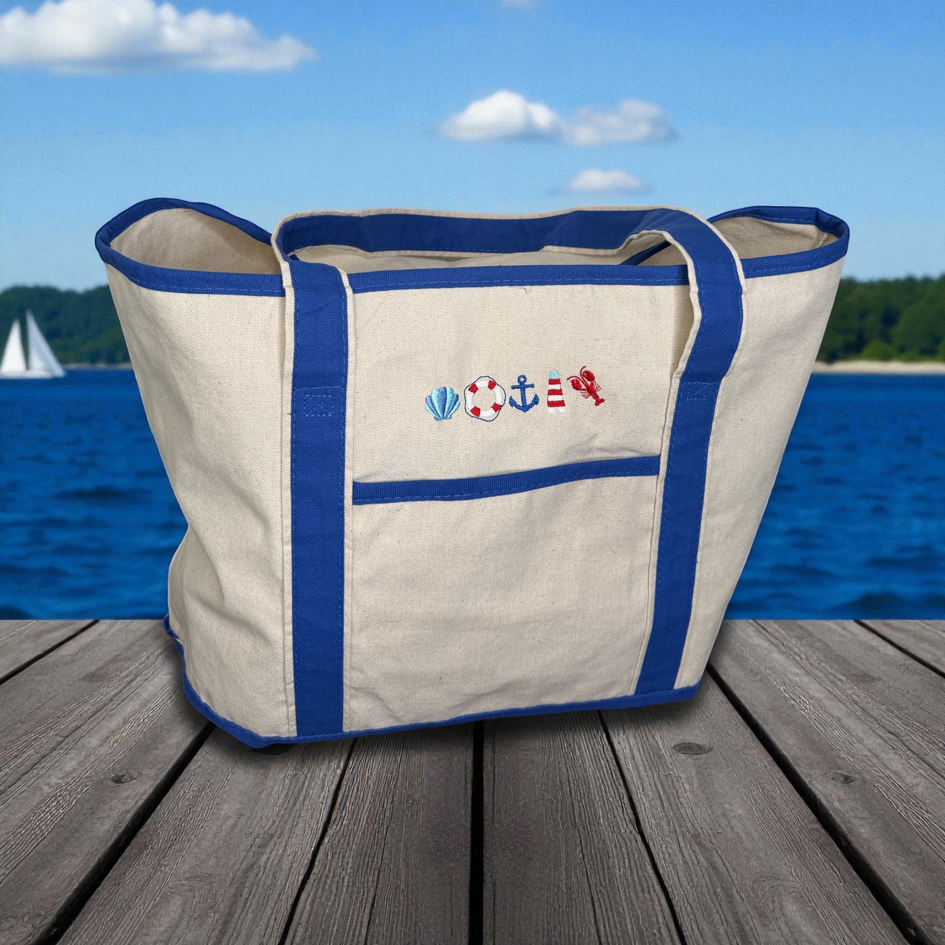 Large quality and durable canvas boat tote bags in a dark royal blue and natural color canvas. The bag has matching blue straps with a pocket in the front. The embroidery is sewn above the pocket. This bag has a coastal chic, Cape Cod/Martha's Vineyard vibes design. This can hold a large quantity and is a perfect companion to take to the beach, sailing or just shopping around town.