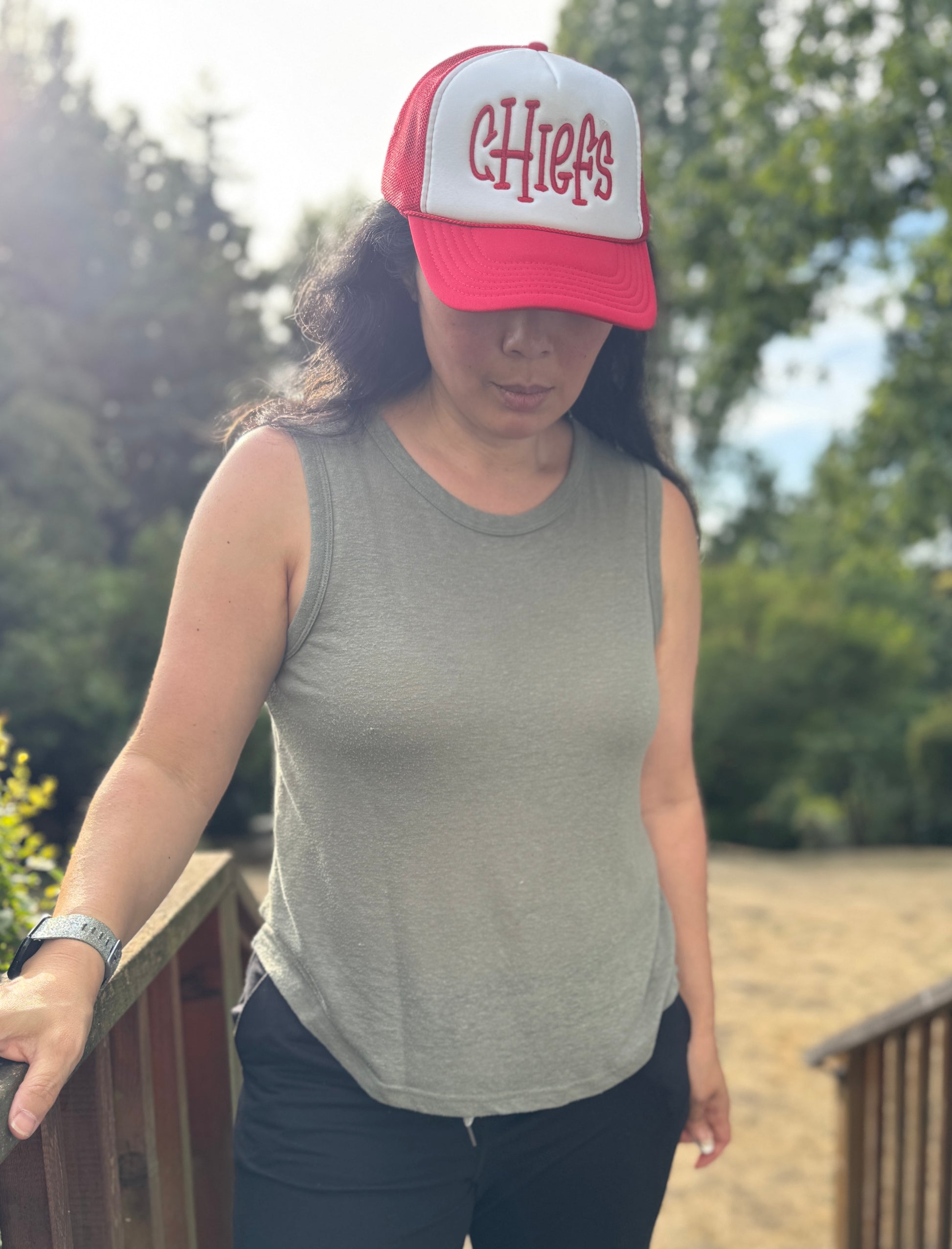 *Listing photo shows the red/white hat with the cardinal red thread color and Font #2.