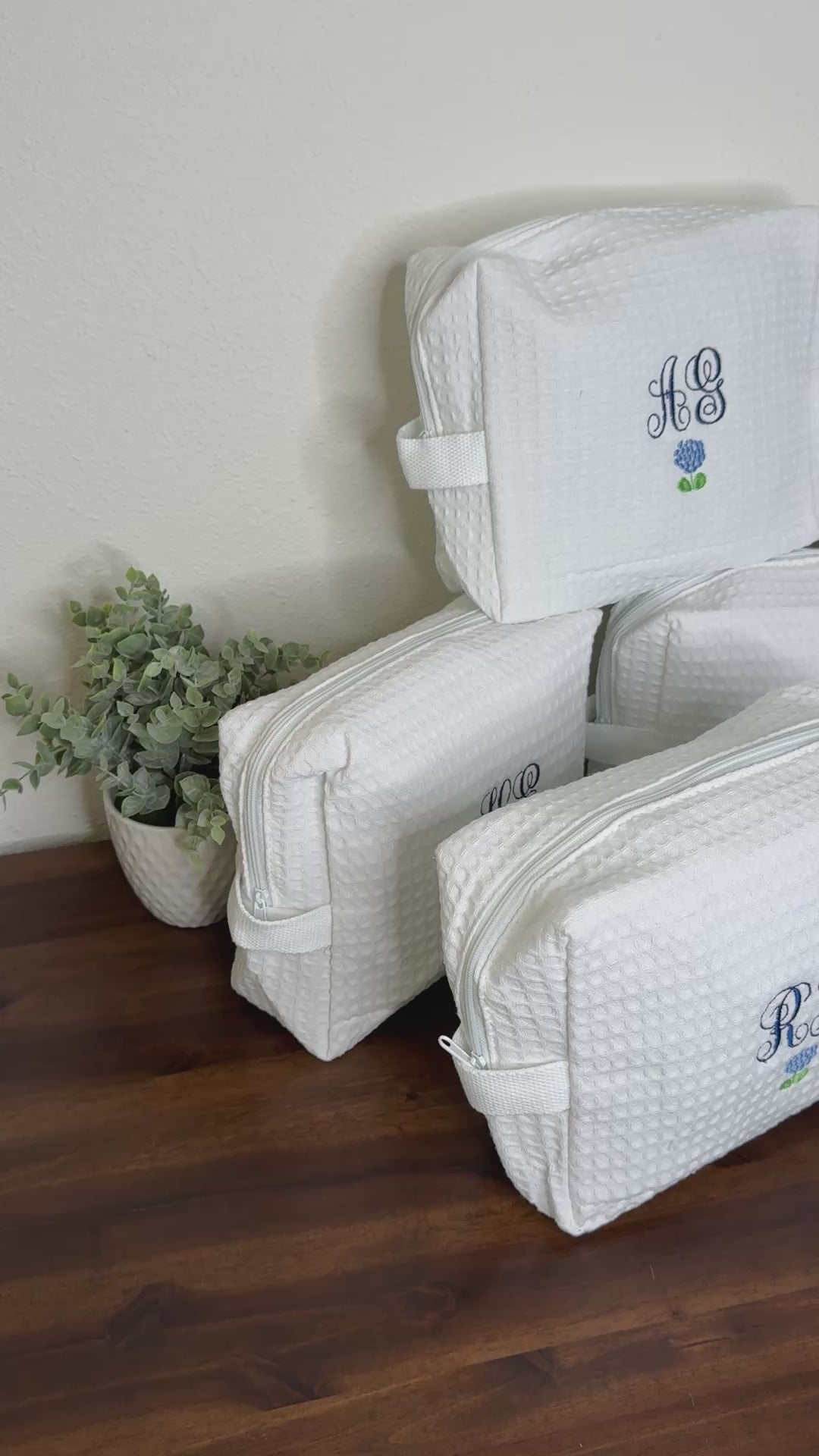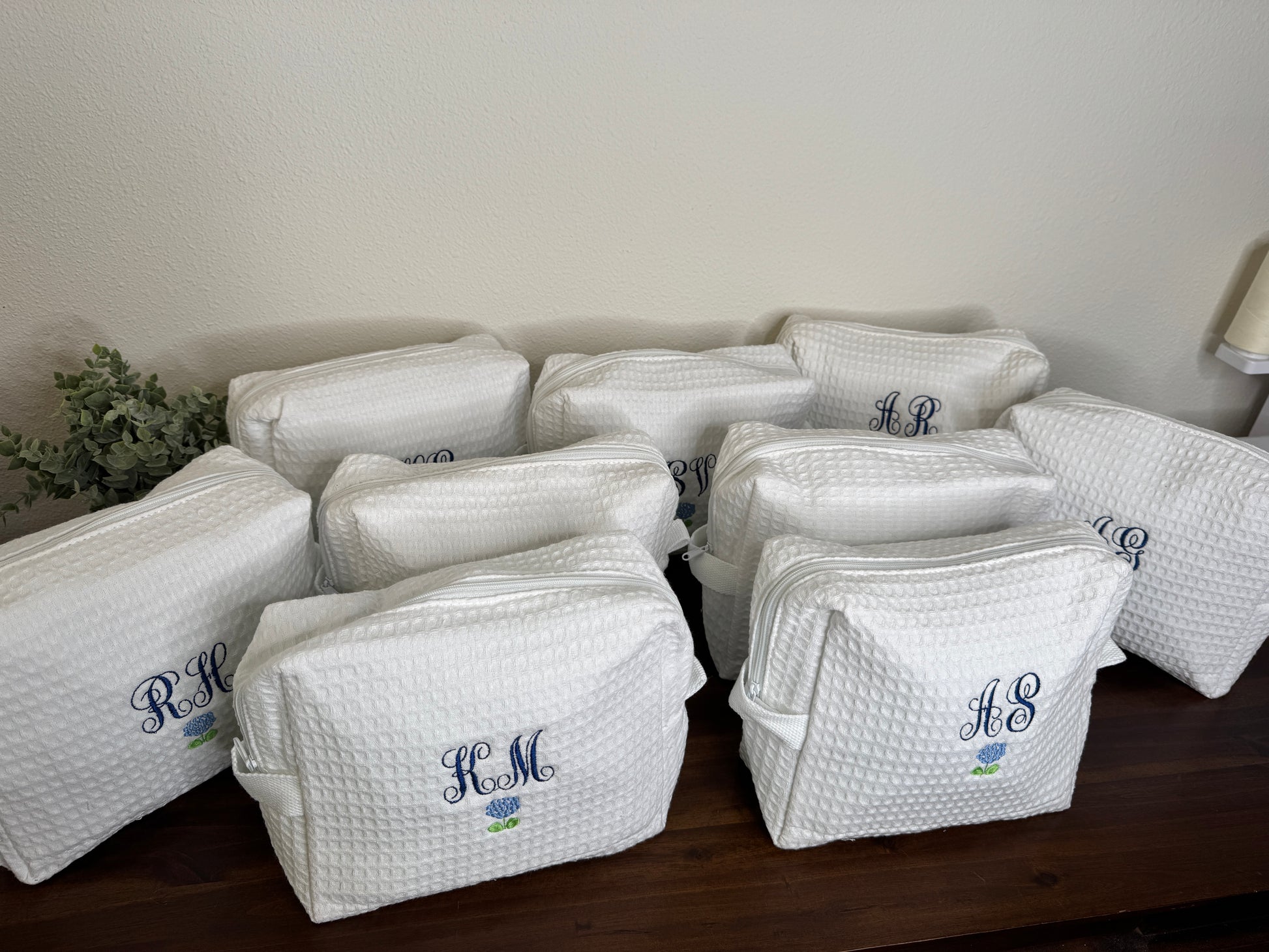 Keep your essentials organized in style with this classy and beautifully embroidered waffle weave makeup/spa bag. Each bag features a delicate flower or fruit design paired with a custom monogram which can be 2 or 3 initials, making it both personal and timeless. These bags are perfect for a bride/bachelorette party or just as a gift for someone cherished.