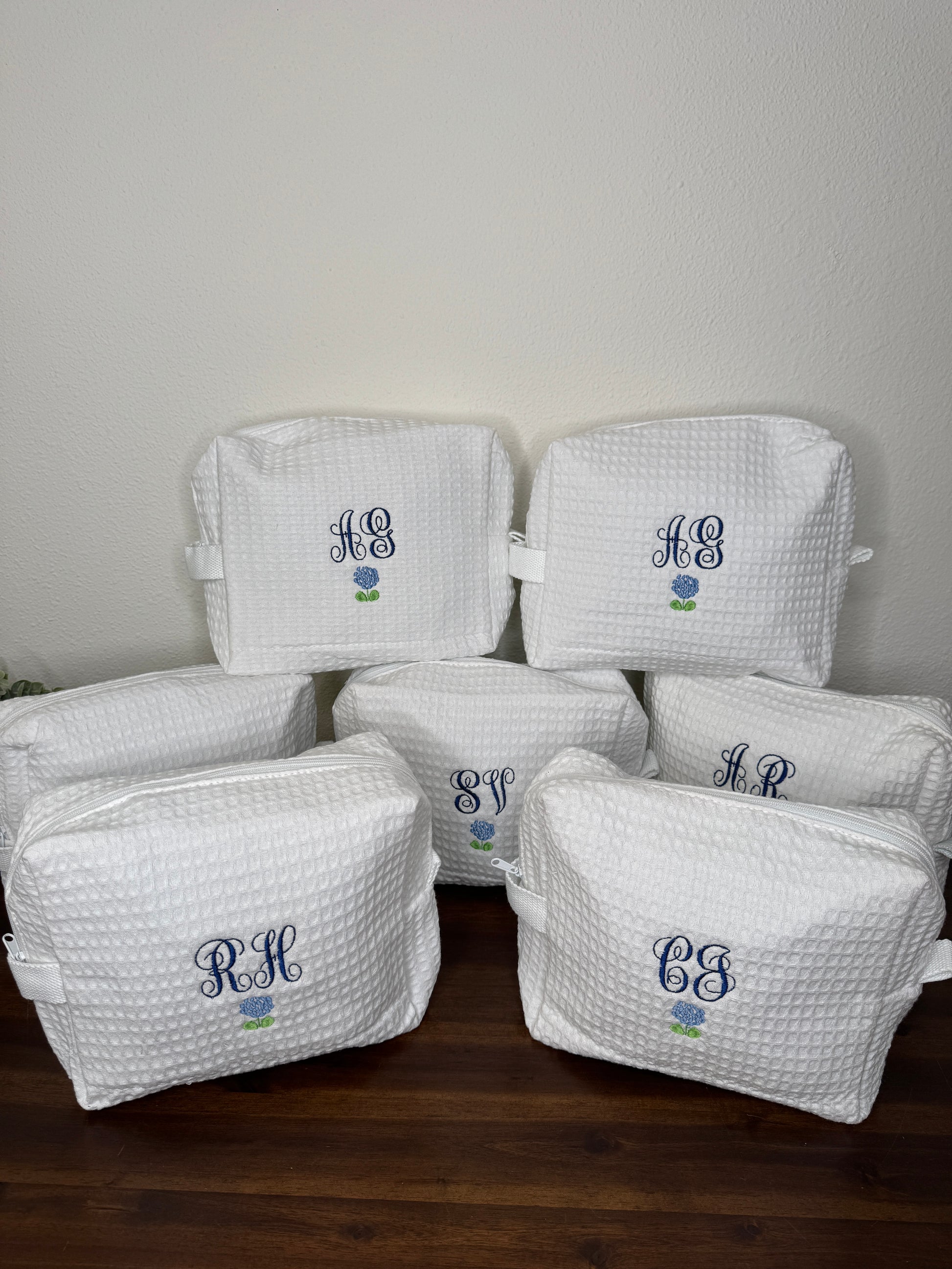 Embroidered Customized Waffle Makeup Bag with Monogram Initials and Flower or Fruit Graphic