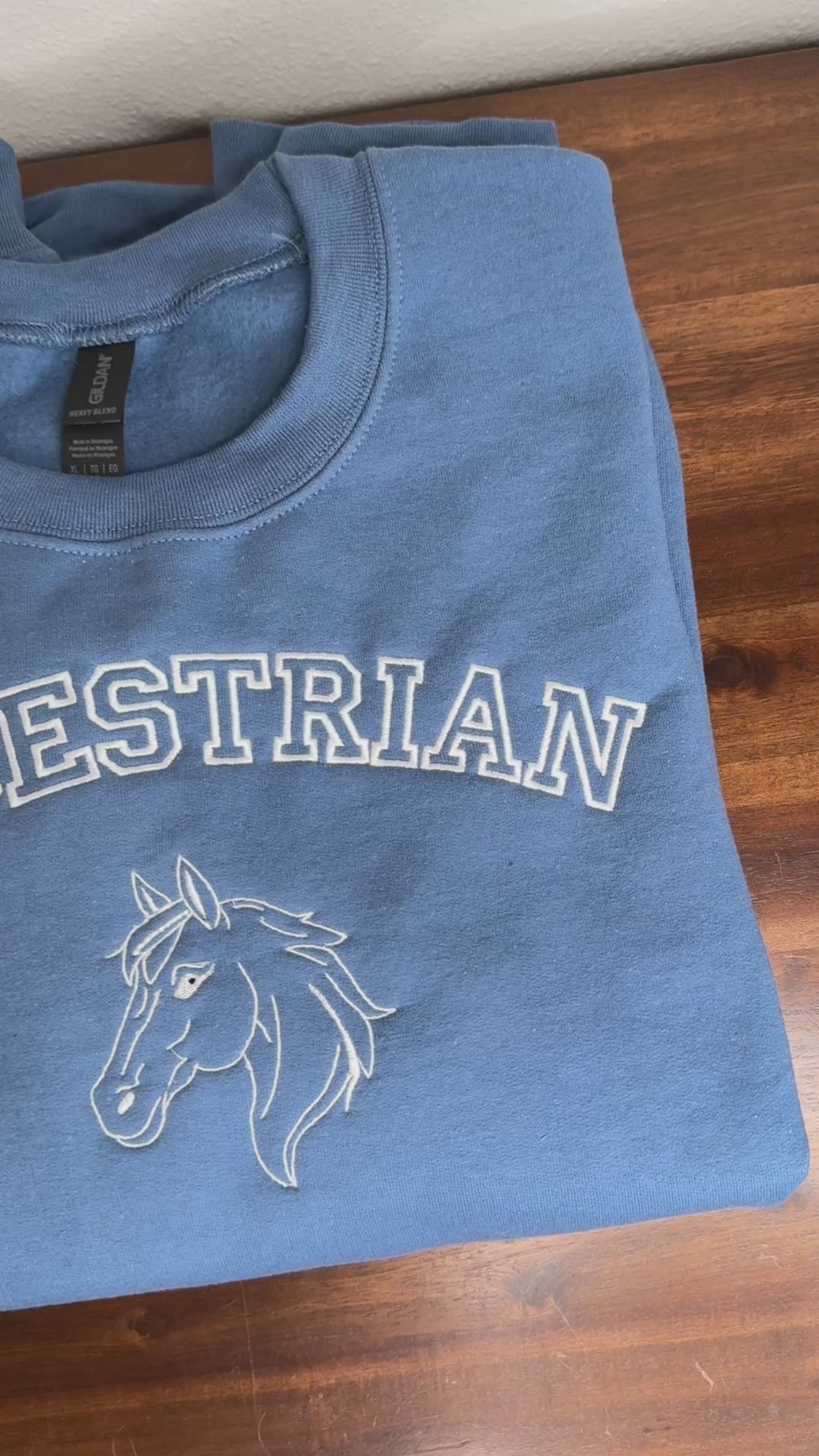 Show off your love for horses in style with this cozy equestrian crewneck sweatshirt. Featuring classic curved lettering finished in a bold and clean satin stitch and a graceful horse design underneath. This sweatshirt is the perfect blend of casual comfort and timeless equestrian flair.