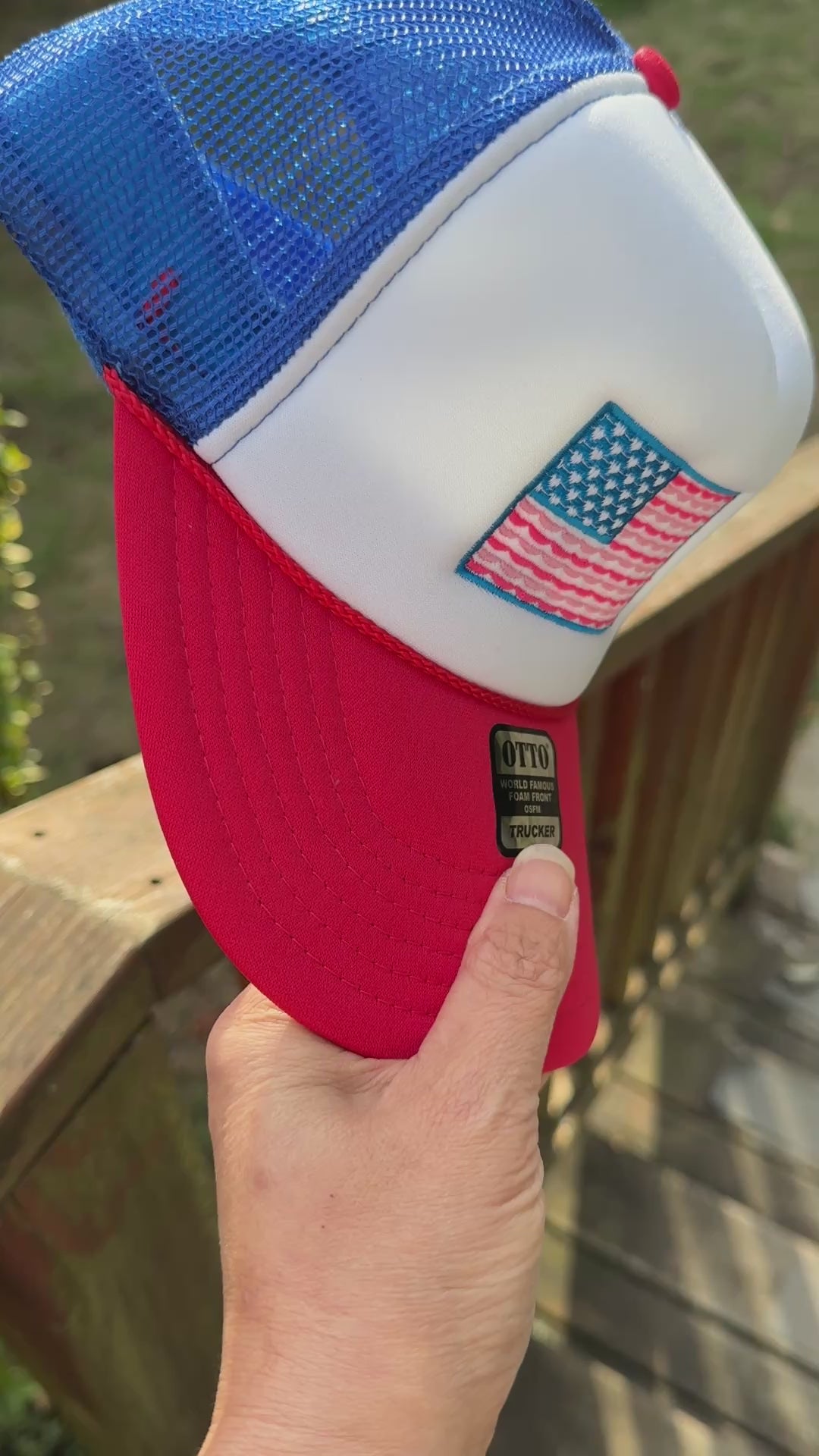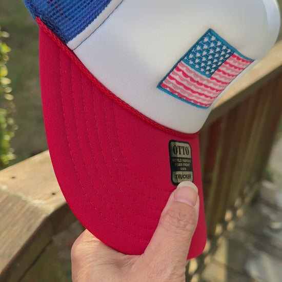 Show off your love for the USA with a touch of coquette charm. This embroidered foam trucker hat by Otto blends classic Americana with a eye catching vintage twist featuring a beautifully stitched USA flag design in two tones of pinks, almost red, blue and white.